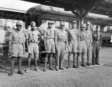 In this 1953 photograph, R. Kelly Bryant, Jr., (left) and several scouts are boarding a train in Raleigh for the third National Scout Jamboree in Santa Ana, California. Bryant served as scoutmaster of Troop 187, headquartered at Durham’s Burton School, from 1951 until 1988. He was also Durham Divisional Committee chairman from 1951 to 1957. In his 37 years as scoutmaster, he led more than 400 boys. After Bryant retired from scouting in 1988, Troop 187 moved to Asbury Temple United Methodist Church, then to Ebenezer Missionary Baptist Church.